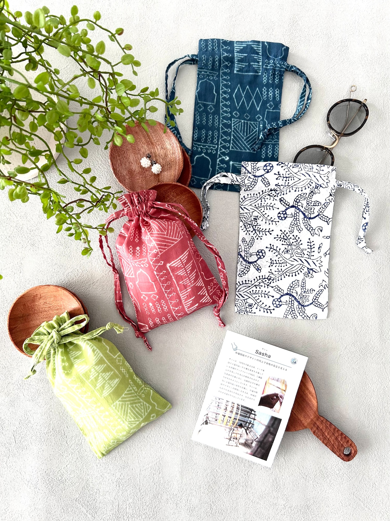 ☆ノベルティには、インドの伝統技法ブロックプリント生地で作られた巾着をお送り致します。