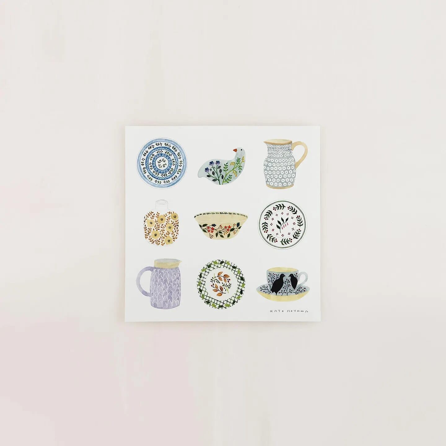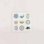 モチーフは左上から右に「お皿」「鳥の置物」「水差し」、2段目「花瓶」「ボウル」「お皿」、3段目「水差し」「お皿」「カップ&ソーサー」。