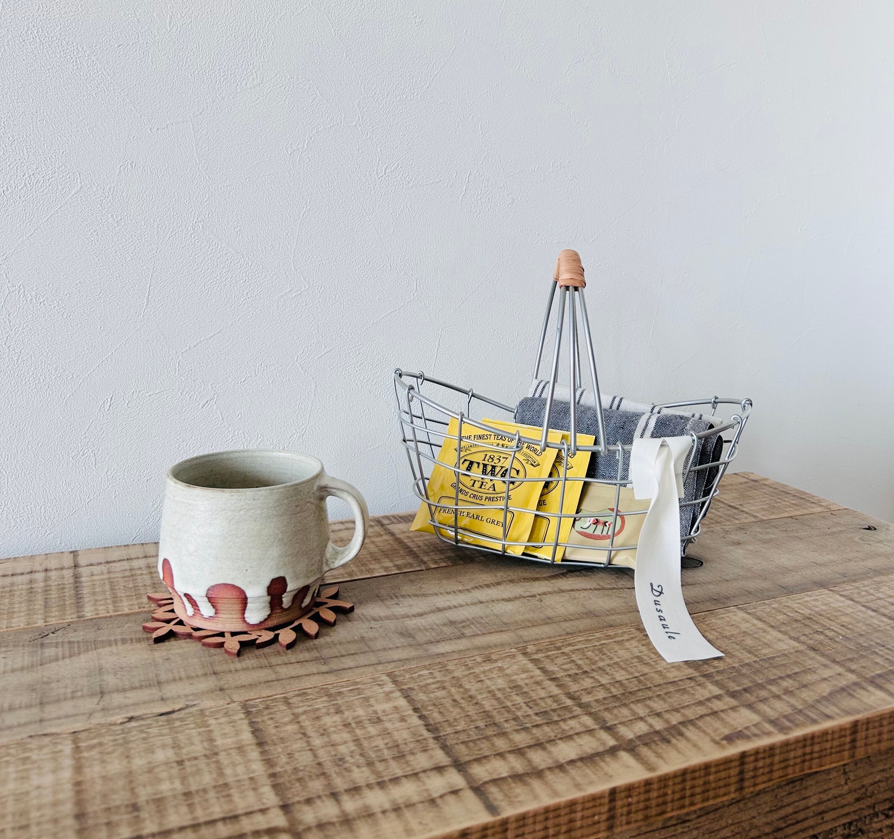 統一感のないものでもワイヤーバスケットに入れることでまとまりが生まれお洒落なカフェのような雰囲気に。