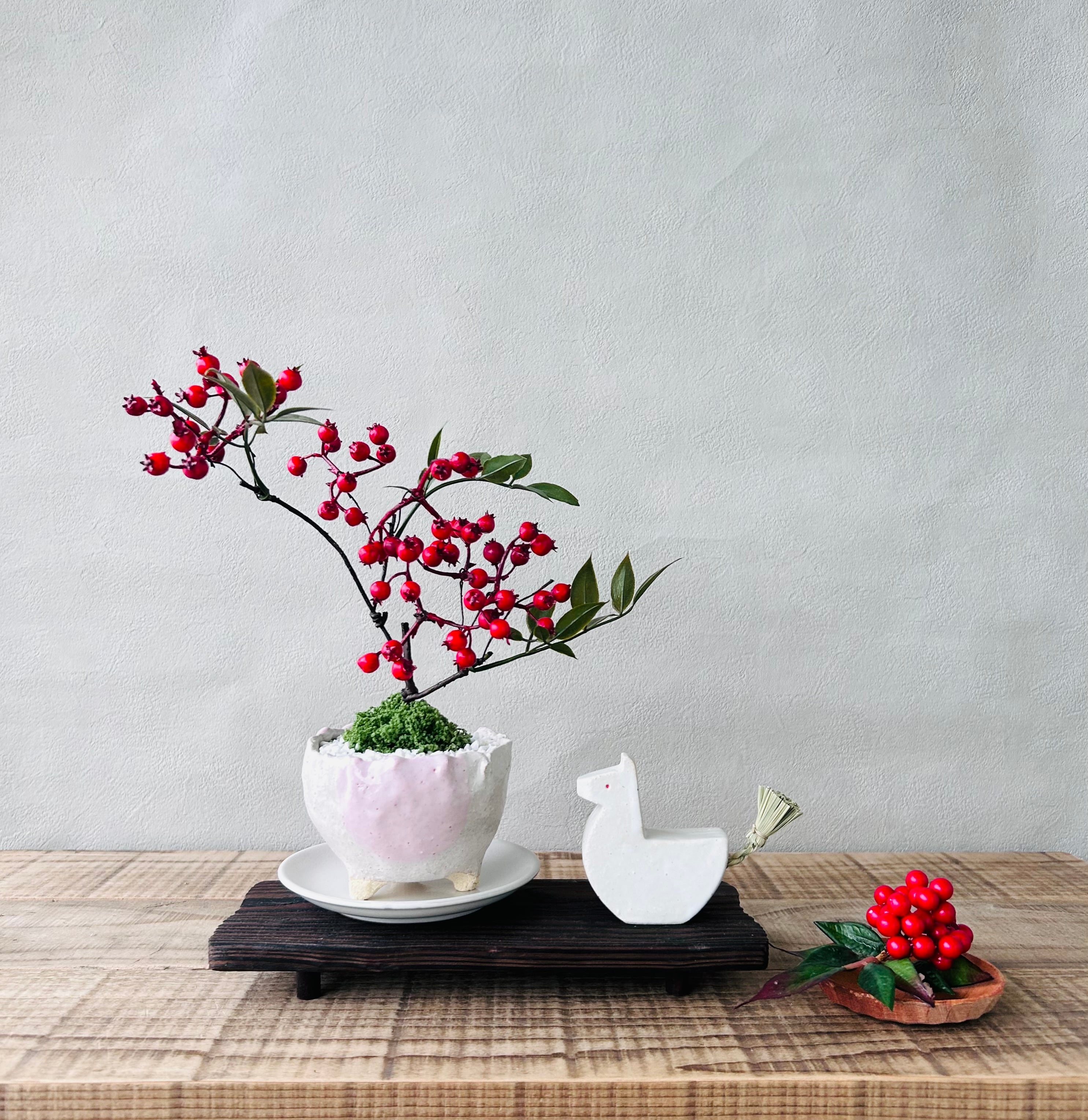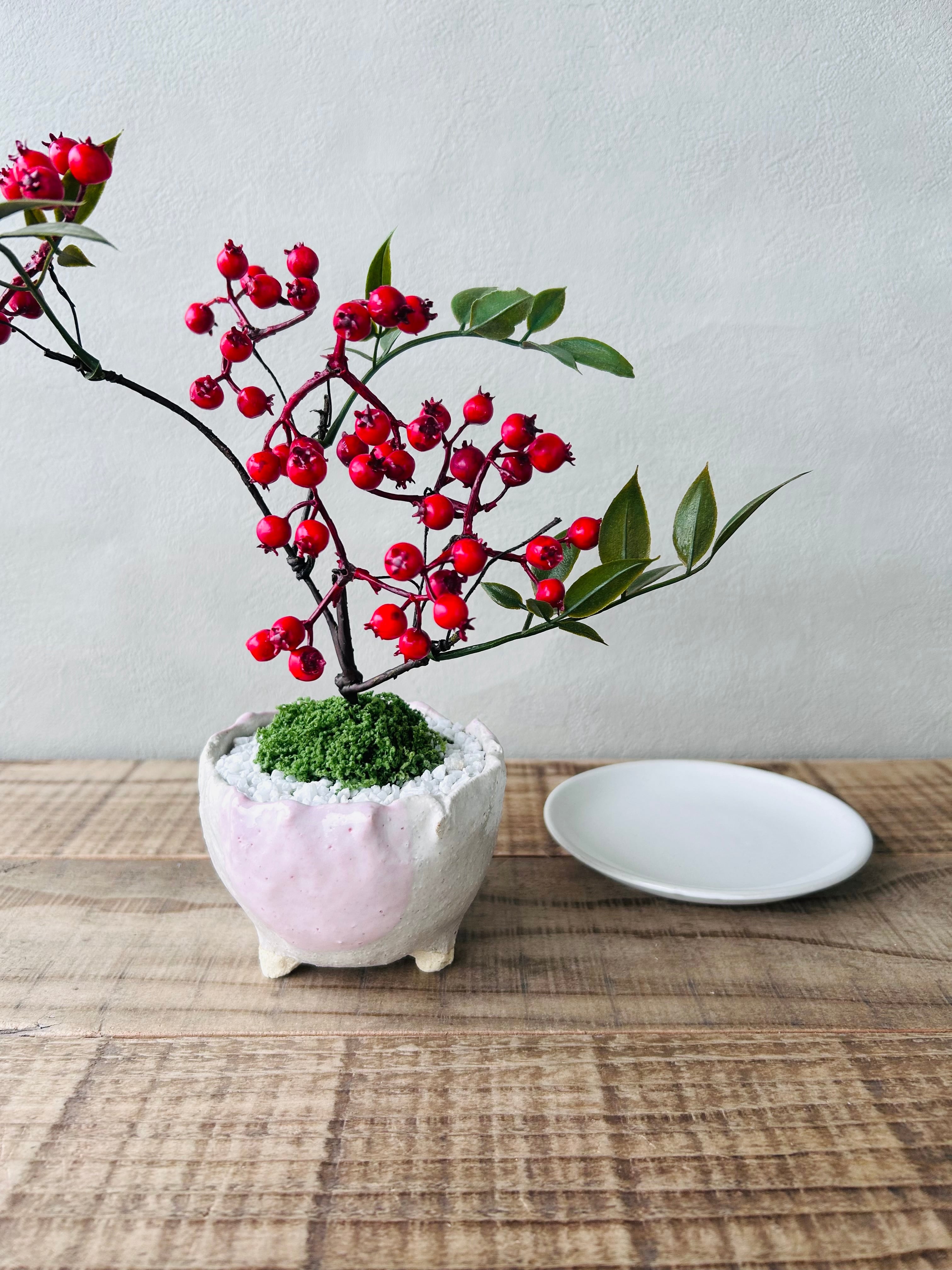 赤く小さな実の可愛さ、白桃の鉢の可愛さ、飾るだけで自然と笑顔になれるような盆栽に仕上げました