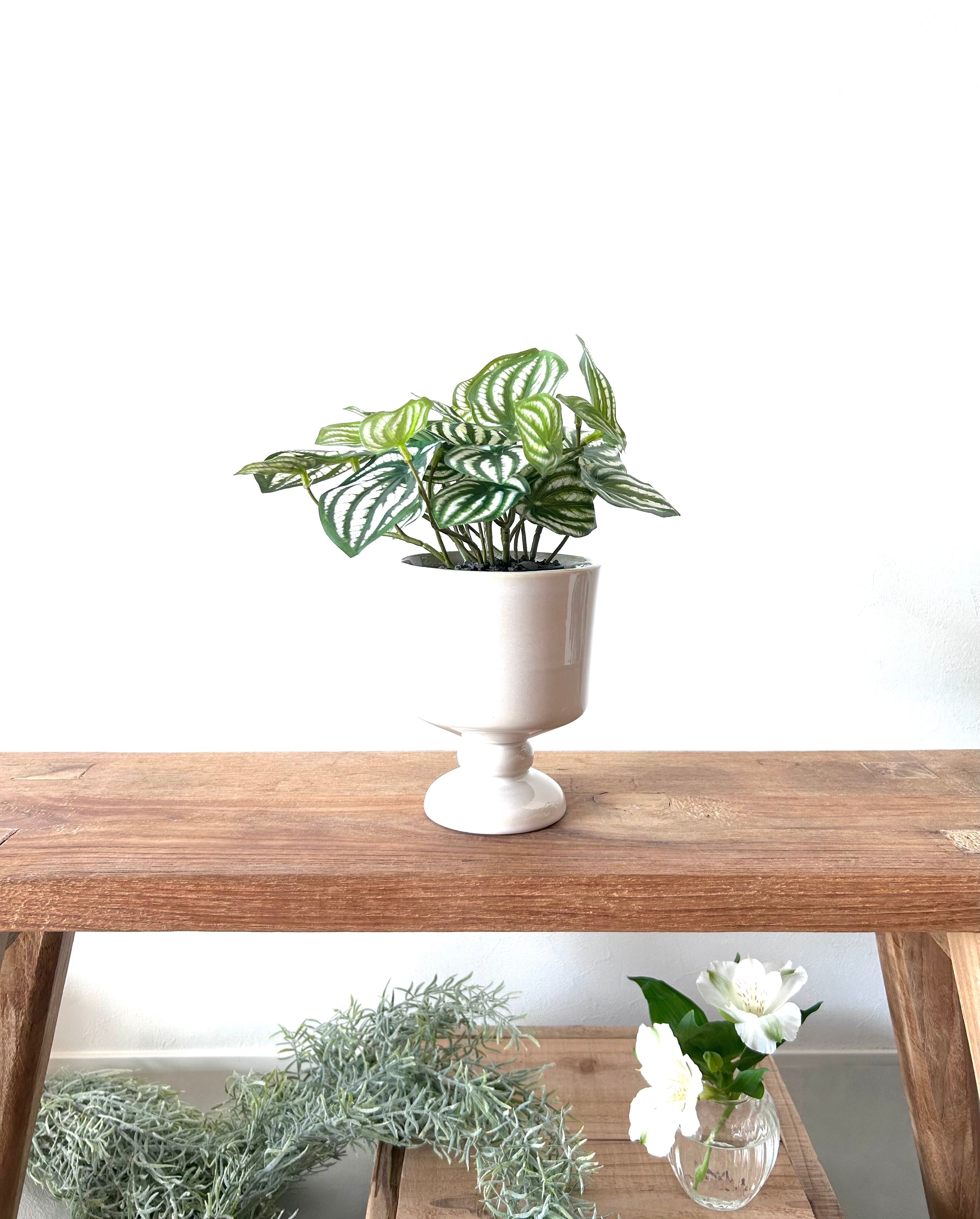 キャンドルスタンドをモチーフにした、クラシカルな磁器製鉢カバーと合わせたフェイクグリーンポットです。